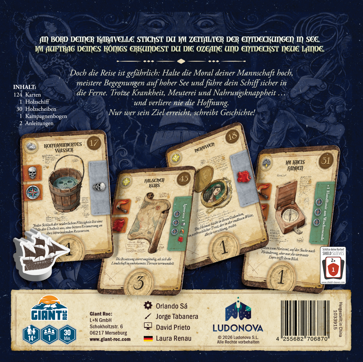 Als Kapitän einer Flotte im Zeitalter der Entdeckungen wurdest du von deinem König auserwählt, unbekannte Länder zu erkunden und die Grenzen der bekannten Welt zu kartieren. Jede Partie stellt eine neue Herausforderung dar, bei der du deine Mannschaft mit Weisheit und Umsicht führen musst, um den Ruhm deines Königreichs zu sichern. Heftige Winde und plötzliche Stürme werden deine Führungsqualitäten auf die Probe stellen, während deine Handkarten dir helfen, die Moral aufrechtzuerhalten und deine Mannschaft über die Meere zu lenken.