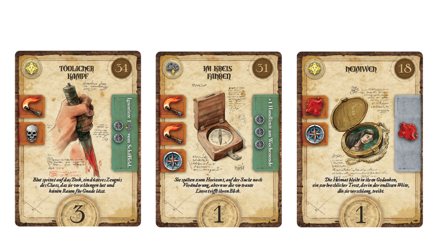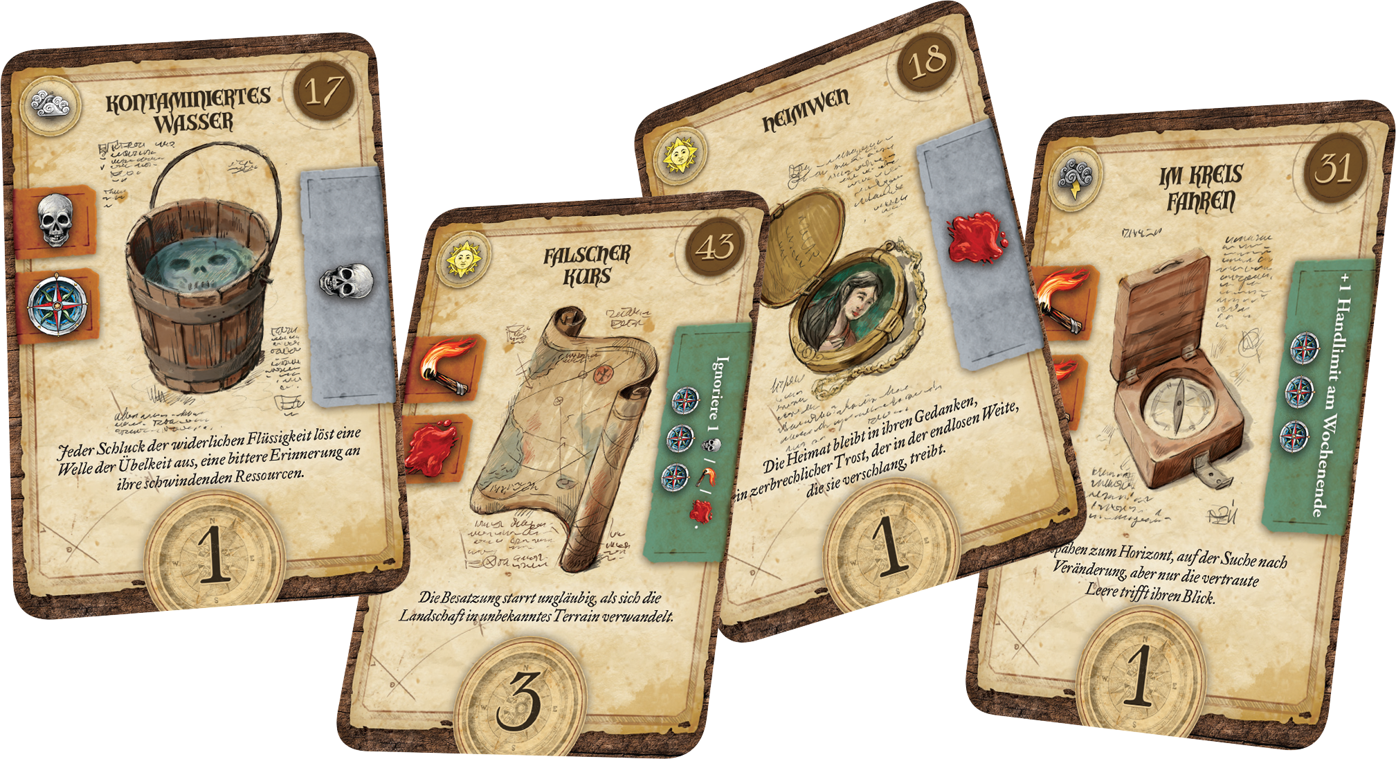 Im Laufe der Partie sammeln sich Traumakarten an, die die wachsende Verzweiflung der Mannschaft darstellen und den Schwierigkeitsgrad erhöhen. Ob in Einzelpartien oder in der zusammenhängenden Kampagne, jede Reise ist eine Probe für dein Durchhaltevermögen in diesem brutalen Zeitalter der Seefahrt.