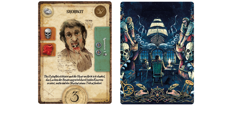 Du kannst allerdings auf zwei Wegen verlieren: Entweder, wenn du in der Ereignisphase opfer einer Meuterei wirst, oder wenn der Stapel aufgebraucht ist und du eine Karte ziehen müsstest – deine Mannschaft ist zu demoralisiert, um weiterzusegeln!