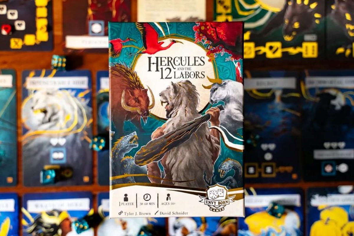 Lies die erste Legendenkarte vom Legendenstapel: Nemeischer Löwe. Lege anschließend die Aufgabenkarte des nemeischen Löwen auf den Tisch und platziere einen Prüfungswürfel darauf – damit beginnt deine heldenhafte Reise.